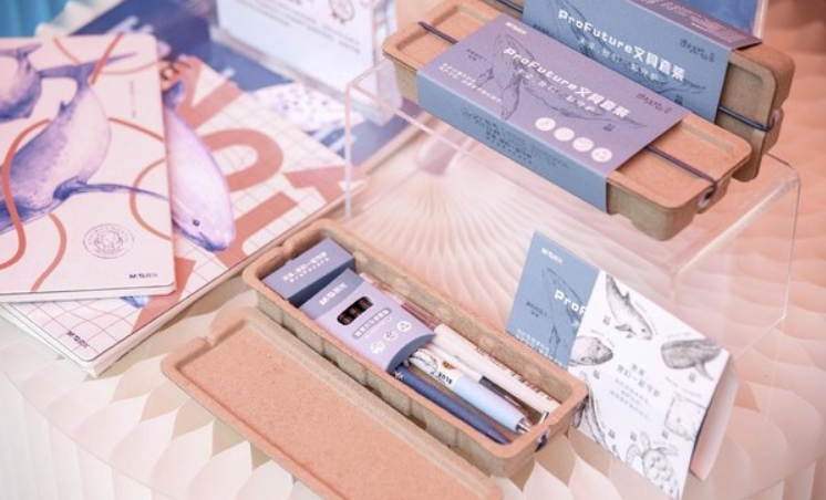 该系列的材质以及设计也紧扣环保:PROFUTURE守护未来文具套装,包装套盒采用可循环的再生纸浆制作而成,具有良好的可降解性;其中的植物残渣中性笔,笔杆部分材质来自甘蔗、小麦、杉木等植物残渣,不同于传统塑料材质,不仅对废弃植物残渣合理利用,又部分可降解,有效降低碳排放;晨光按动款大容量中性笔大墨王,可以达到普通中性笔的3倍书写长度,也因此减少了不必要的塑料消耗…