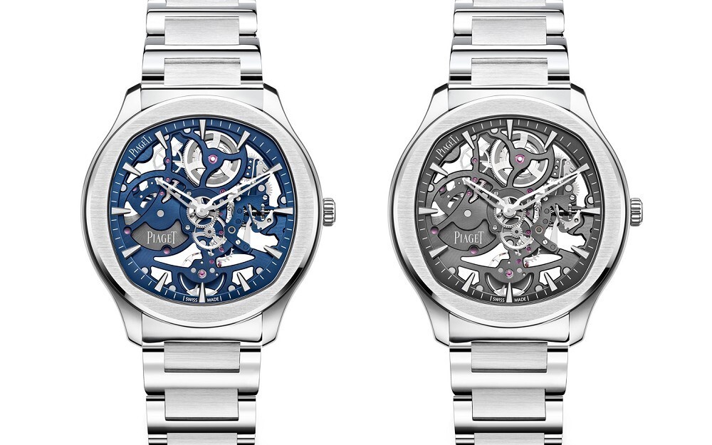 高度镂空机芯直接展现在表盘正面,经过蓝色或灰色 PVD 涂层处理后,依然展现细腻动感的光影反射。透过蓝宝石水晶表镜,你可以直接看到12点发条盒的松紧、3点齿轮系的上链过程、6点摆轮擒纵和9点微型摆陀,让这枚双针表也如同复杂功能腕表一样吸睛。时针和分针同样采用镂空设计,12枚楔形时标镶嵌于表盘外缘。