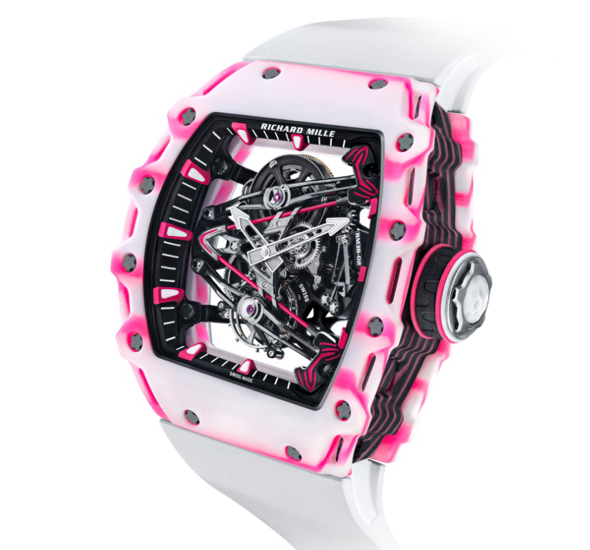 然而,这款腕表将Bubba自成为RICHARDMILLE品牌挚友第一天起就埋藏于心的愿望表达得淋漓尽致。这个不对称的表壳在2点到5点之间逐渐变窄,从而抵消了扭矩限制表冠在手腕上的摩擦。镂空表圈带来了视觉冲击力,突出了这款腕表的运动性,并且Carbon TPT®碳纤维与粉色QuartzTPT®石英碳纤维中层表壳形成奇妙的风格对比,最终烘托出这款彩色腕表的鲜明特性。